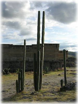 遺跡の前ににょきっと生えたサボテン。まるで遺跡をバックに記念写真を撮ってもらっているかのよう。しかしサボテンってカワイイもんだな〜 |