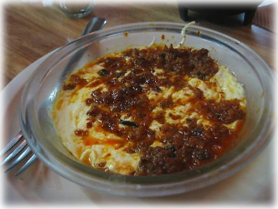 ![]() 忘れちゃいけないオアハカの特産品といえば、チーズ。さっぱり目の味なので、こんなふうに一品料理として出てきても、ペロリと食べられてしまう。実際に食べてみると、ゴムのように長〜く伸びるのだ。写真はカスエラ・デ・ケソという名物料理 |