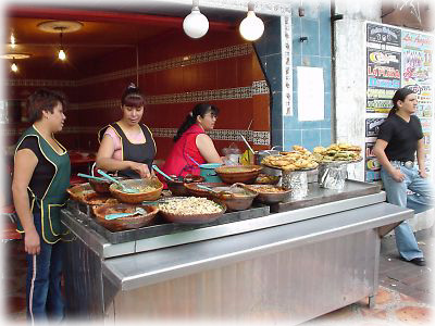 市場を散策して小腹が減ったら屋台でタコスでも食べましょう。こうやってアチコチの屋台で色々食べられるのも、メキシコの街歩きが楽しい理由のひとつだ |