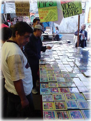 この市場で特筆すべきは、海賊盤が多いこと。音楽CDは1枚約100円という安さも魅力。みんな真剣に品定めしていて、ついつい私たちも買い込んでしまった |