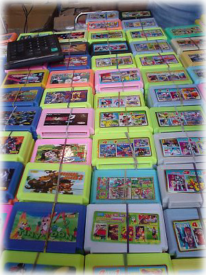 海賊盤は音楽ソフトだけでなく、ゲームソフトも多い。アジアなんかでよく見かけた、1本に何本も入っているファミコン・ソフトにも久々にお目にかかりました |
