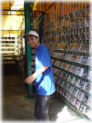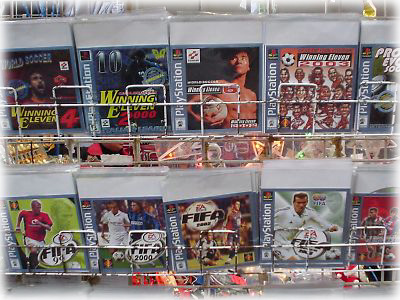 ![]() ゲームの種類も多種多様で、ちゃんとジャンルごとに区分けしてあるほど品揃えが充実している。こちらはプテステ・ソフトのサッカーゲーム・コーナー。1枚約50円と感激の安さで、マニアが見たら、たまらないでしょう。もちろんコレも海賊盤。ちなみに写真上段中央に中山ゴンを発見! |