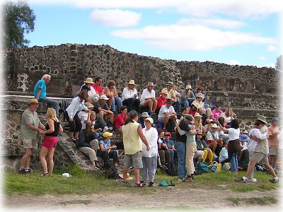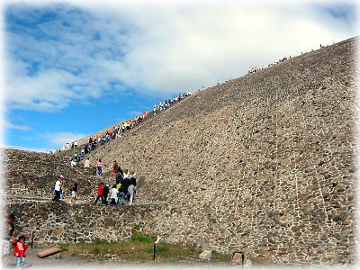![]() 近寄ってみると、その巨大さにただただ見いるばかり。しかもこのテオティワカンは、紀元前2世紀から発達した宗教国家で、紀元350〜650年に繁栄の頂点にあったとか。そのころの日本の歴史を考えると……恐れ入りました、ハイ |