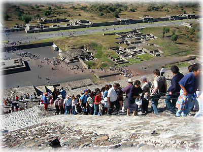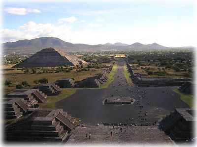 ![]() 月のピラミッドの頂上から遺跡の全体像が見える。正面にまっすぐのびているのが死者の道。こうして上からぼんやり眺めていると、この遺跡を造ったテオティワカン人がいかに高度な文明を持っていたかがわかるのだ |