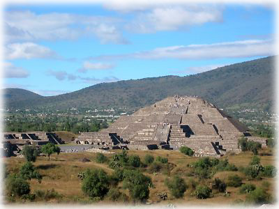 ![]() 太陽のピラミッドから月のピラミッドを眺める。大きさでは太陽のピラミッドのほうがうえだが、位置的にも手前の広場の大きさからしても、月のピラミッドのほうが重要度が高かったと考えられている。遠目で見ても実に美しい建築物です |