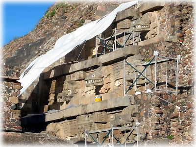 ![]() テオティワカン遺跡のなかでもその装飾美で知られるケツァールコルトの神殿。でも、現在は工事中で、レリーフはほとんど見えない。美人が台無しだなあ…… |