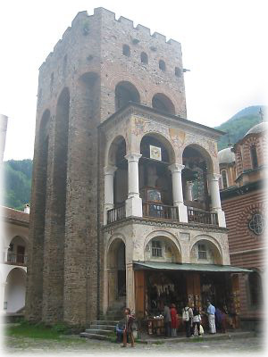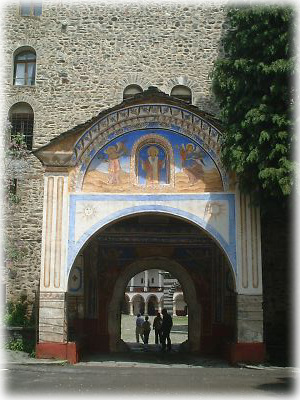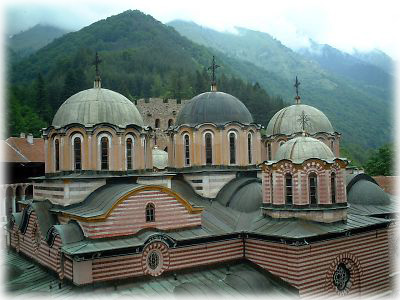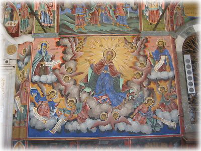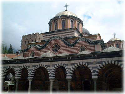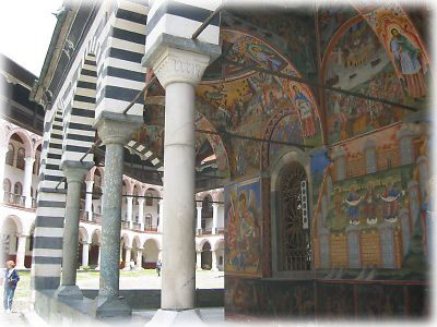 フレスコ画は1枚がこのぐらいのサイズで、これが教会の側面をビッチリ埋め尽くしているのです。教会ではあるけれど、この聖人の数といい、色の鮮やかさといい……多神教で知られるインドのヒンドゥー寺院を彷彿とさせます。うーん、あなどれないぞ、リラの僧院 |
