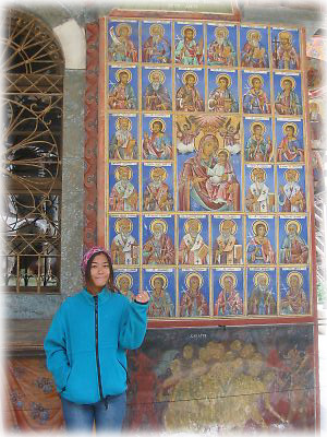![]() 僧院の中にある博物館にて、社会化見学? で来ていた美少女たち。ブルガリアは美人が多いけれど、美少女も多いのね。おばあちゃんも奥からけげんな顔で見ている |