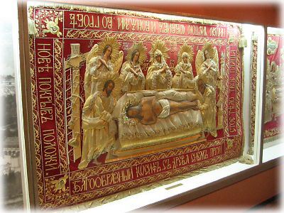 ![]() 博物館にあったタペストリー。横たわるキリストが見える。赤くてピカピカしていて、これまた派手! |