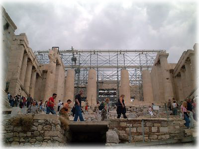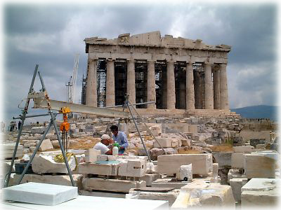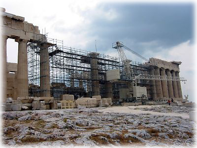 ![]() パルテノン宮殿は紀元前438年に完成したもの。そんな大昔にこんなものがあったのもスゴイけど、それをいまも修復しているというのも、よく考えるとスゴイ。宮殿の目の前にはせっせと修復作業をしている人たちが……。ご苦労様です |