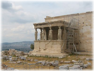 ![]() パルテノン神殿の脇にあるエレクティオン。こちらも完成は紀元前408年と、2500年以上の歳月を経ているもの。6体の少女像を柱としていて、なんだか古代アテネのロマンチックな建築美を物語っている |