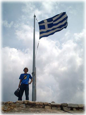 アクロポリスの丘には、空にはためくギリシャ国旗が。ブルーと白のコンビネーションは、国旗のなかでもかなりイケてるほうではないでしょうか? |