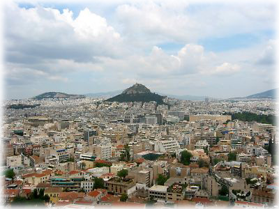 ![]() アクロポリスの丘から眺めるアテネ市内&リカヴィトスの丘。遥かかなたまで続く家々と丘のアクセントは、思わずため息をつく美しさ |