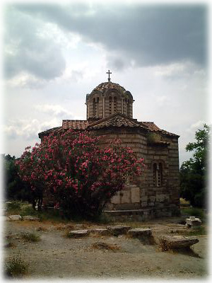 古代アゴラの中にある教会。これ自体は歴史ある建物ではないが、趣があって、なんともいい感じ。私たちの行った時期はちょうど緑が溢れていて、どこもかしこも絵になっていた |