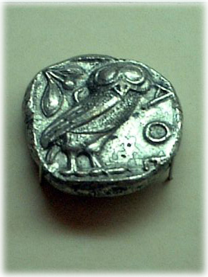 ふくろうが刻まれた古代ギリシャの硬貨。「どっかで見たことあるな〜」と思っていたら、実はこれ、現在のギリシャのユーロ・コインにも使われているのです。ギリシャ人がいかに自分たちの歴史に誇りを持っているかがよくわかりますな |