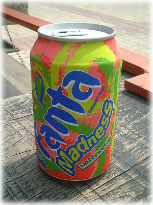 ギリシャ限定? のファンタ、その名もマッドネス。すごい名前だあ〜しかも缶もおどろおどろしい〜とビビってしまいましたが、お味はさわやかなスイカ味。なーんだ |