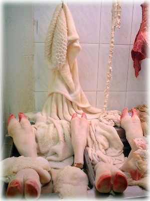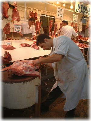 この市場はとにかく品数が多く、肉魚野菜となんでも揃ってます。この通り、豚さんの足から、謎の内臓まで……ギリシャ人の食べ物に対する意気込みがひしひしと伝わってくる |