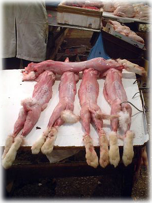 皮をはがされたウサギちゃんがぐで〜っと並べられておりました。しっぽと足だけ毛が残っているのがご愛嬌? |