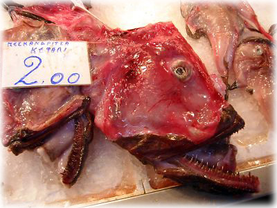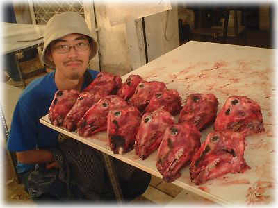 ![]() 市場でいちばん強烈だったコイツ。コレは一体何? アンコウ? ぐえーっと開いた口といい、ギョロリとした目玉といい、迫力満点。これも……いったいどうやって使うんだろう? |