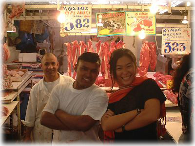 ![]() このふたり、「肉屋になってみない?」、「そうね……」なんて会話があったとか、なかったとか。しかし私ってば、肉屋がよく似合うなあ(笑)。ここの市場は、働いている人も威勢がよくて、実に理想的な市場なのです |