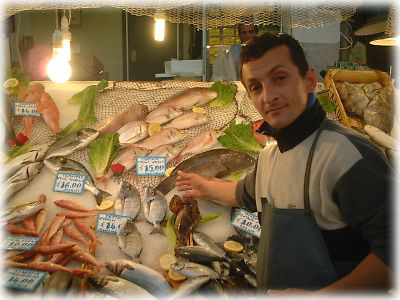 ![]() 肉もさることながら、魚介類の充実っぷりにも目を見張るものがある。どの店も種類も数も豊富で、魚介類好きの日本人にはたまらないでしょう。お兄さんの顔もどこか築地のあんちゃん風? |