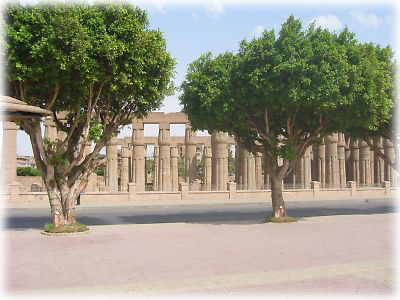 ![]() ルクソールの道ばたの街路樹は生活必需品。とにかく陽射しが強く、木陰で休憩しないとやってられない。その奥にはルクソール神殿が見える。並んだ柱がキレイ |
