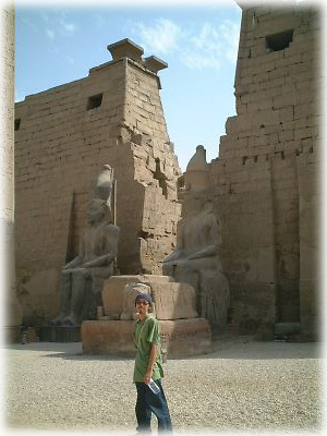 ルクソール神殿前にて。夫の身長(180cm)を考えると、壁の高さはけっこうある。入り口左側に座っているのがラムセス2世像。右側は……知りません(笑) |