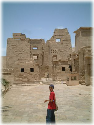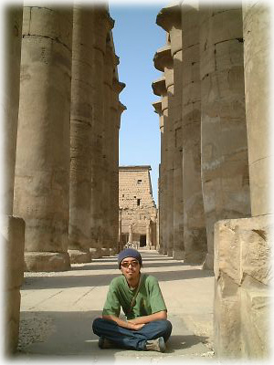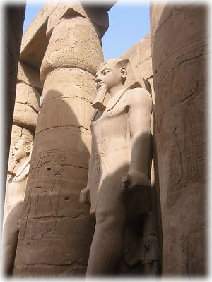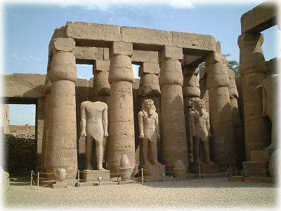 ![]() ラムセス2世像のある入り口を経てラムセス2世の中庭に入ると、またもラムセス2世像が(笑)。ラムセス王というのは何人もいて、ルクソールをまわっているとよく登場する王様だ。それだけに「アレ、これはラムセス何世だっけ?」とごっちゃになることもしばしば |