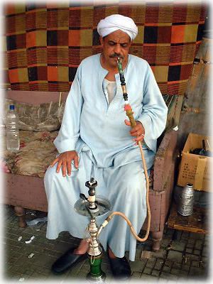 シーシャ(水パイプ)を吹かすおっさん。ううむ……こういう写真はエジプト人にはかなわないな(笑)。エジプトに着いたときにまずビックリしたのが、このシーシャを吸うおっさんが多いこと。なんだか悪いことしてそうだし(笑)。ちなみに女性が吸っているのは一度も見かけなかった |