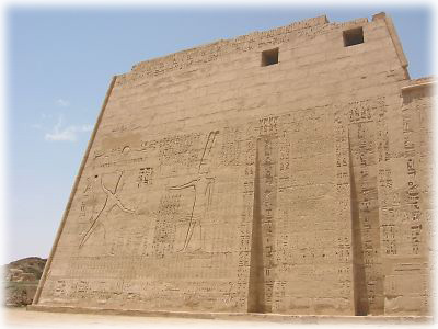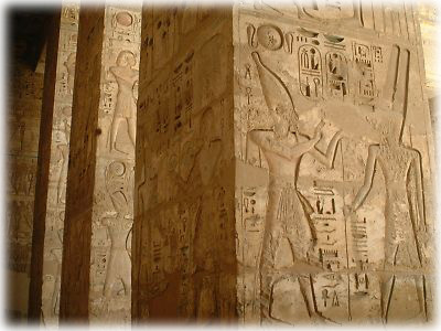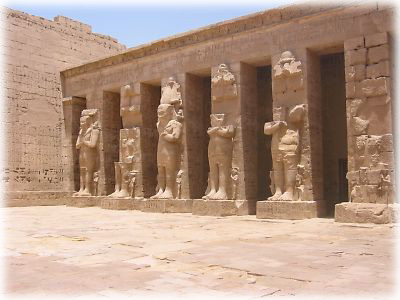 ![]() 凱旋門にも、勇ましいラムセス3世の姿が彫られている。いかにもエジプトらしい、壮大にして繊細な佇まい。とにかくここは美しく彫られたレリーフがいたるところにある |