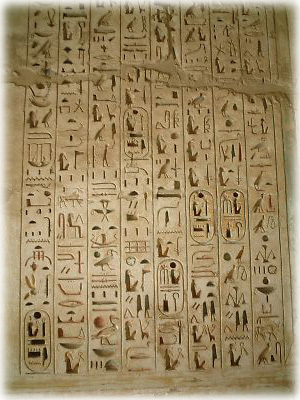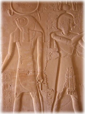 ![]() 墓の壁面に描かれた装飾。古代エジプトは多神教の宗教で、遺跡にも神様がいっぱい。中には体は人間、顔は猫という神様だっている。写真右は太陽神「ラー」。頭の上に太陽をしょっている(笑) |