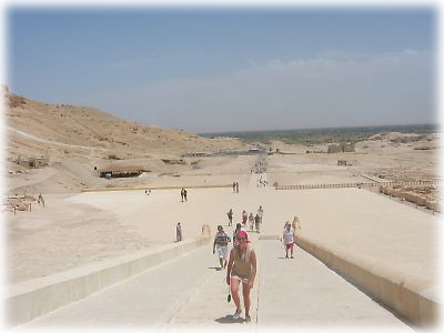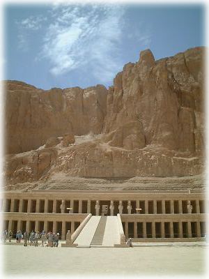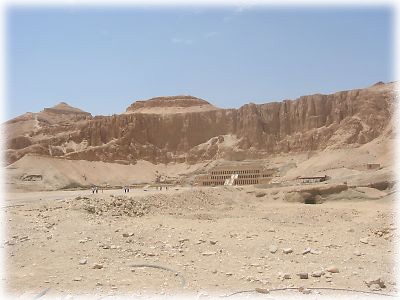 ハトシェプスト女王葬祭殿は、砂漠にそびえたつ岩壁の前に、デデンと陣取っている。絶景。ハトシェプストとはエジプト初の女王で、かなりやり手な人だったらしい |
