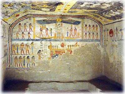 ![]() 墓の奥部、お棺が安置される部屋には、天井まで壁画が描かれていた。古代エジプト人の宇宙観を表す絵で、色味までくっきり残っている。写真では伝わりにくいのだけど、この絵は本当にスペーシーで、しばしこの空間で立ち止まってしまうほど |