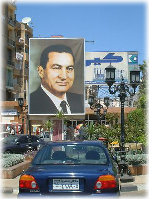 ババーンという感じでムシャラク現大統領の看板が駅前の道ばたに突如現れました。濃いです。迫力あります。彼のブロマイドを持っていたら魔よけになりそう |
