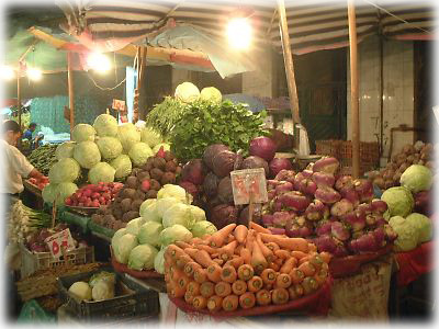 ![]() 八百屋さんも、このとおり。山盛りになった野菜は新鮮でおいしそう。しかも安い! 市場は夜更けまでお店もお客さんも活気がいっぱい |