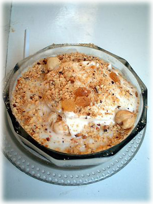 エジプトでうまかったものナンバー2、ライスプリン。お米でできたトロトロのプリンのうえに、ナッツ類が散りばめてある。アレキサンドリアの有名店にて。お味のほうは、「おいし過ぎてほっぺがおちる」という意味が身を持って体験できるうまさ |