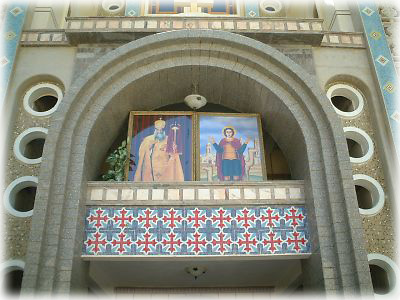 ![]() アブ・ミーナーの修道院&教会は聖メナスを祭ったもの。入口でも彼が両手を開いたポーズでお迎えにきてくれます(写真右)。ちなみに彼は4世紀の人で、彼が死んだ直後からさまざまな奇跡が起こったとか。しかし、近くで見ても不思議な建物だ(笑) |