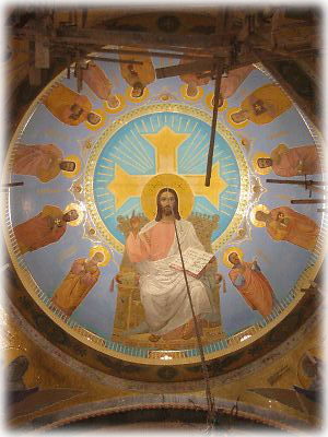 教会天井部には金ピカのキリストが。ちなみにコプト教はキリスト教のひとつ。コプト教の名前はかろうじて知っていたけれど、「エジプトでキリスト教」というのはなんだか意外でした。現在もエジプト国内に多数の信者がいるらしい |