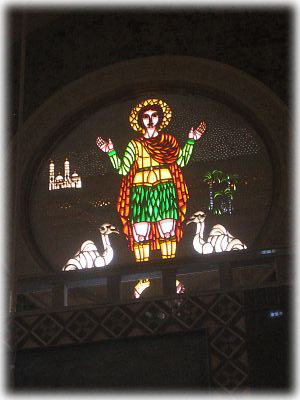 聖メナスのステンドグラスは素朴でいい感じ。教会内部では「あ、メナス!」、「こっちにもメナス!」というように、彼の姿をよく見かけます |