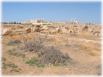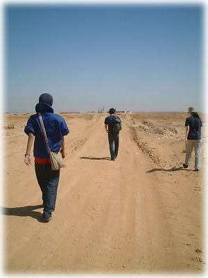 修道院を出て、砂漠の道をトロトロ歩き、遺跡へ移動。湿度はないけれど、陽射しが強い。しかし砂漠って静かですねー。思わずみんな無言で歩いてしまいました |