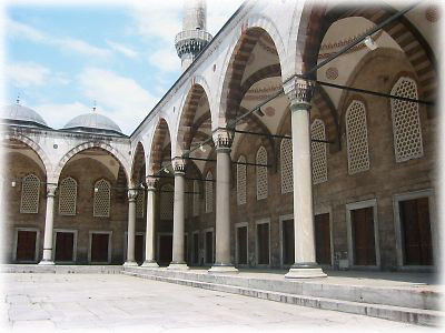 ![]() ブルーモスクの中庭。曲線と直線の均整のとれた美しさがスバラシイ。このブルーモスクはいまでも礼拝に使われている現役で、観光客は礼拝の間はモスクに入れないことになっている |