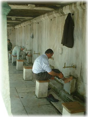 モスク脇にはお清めのための手洗所がズラーっと並んでいて、おじさんたちが黙々と手足を洗っていました。熱心な人はこうして1日5回、手足を洗い礼拝に臨みます |