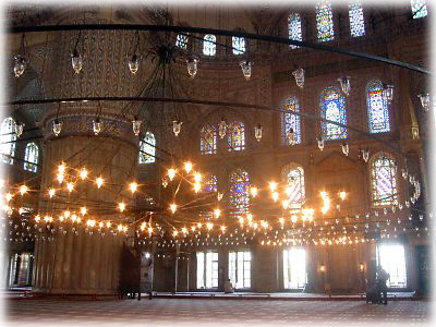 ![]() ブルーモスクの内部には、こんなシャンデリアがデデーンと飾られていました。ステンドグラスが施された小窓からの光がほんのりと柔らかい |