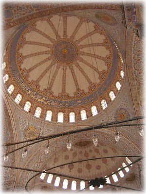 ブルーモスクの天井。ブルーモスクは青を基調にしたデザインからその名前がついたが、実際にはそれほど青くない。けれど繊細な唐草模様が織り成す壁面は全体としてみると連続した美しさがあって見とれてしまう |