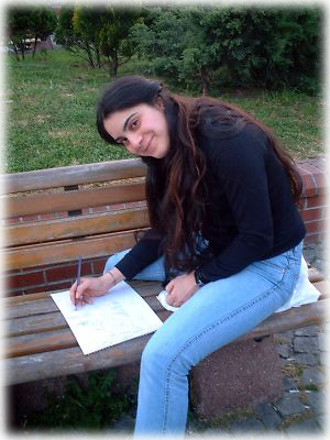 ブルーモスクをスケッチしていた美少女。トルコの女の子は目鼻立ちのくっきりした子が多く、美人が多い。黒い目と黒い髪の子も多く、日本人好みかも |