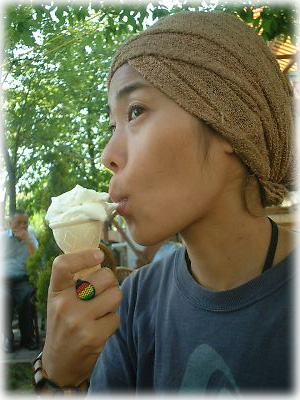 トルコの名物菓子のひとつ、伸び〜るアイス。ダンダルマと言って、味は普通のアイスなんだけど、なぜか粘性がある。なんだか顔まで伸びてる? |