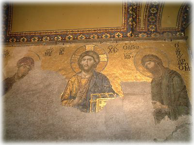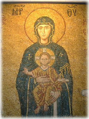 こちらがマリアのモザイク画。4世紀から教会として、15世紀からはモスクとして使われてきたこの建物には、いたるところにこういったモザイク画が残っている。優しげなマリアの顔もトルコ風? |