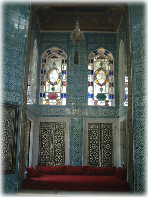 タイルの美しさはトルコ随一と言われる「ムラト3世の間」。天井までびっしりとタイルで埋められています。とにかく装飾が激しいのに、スッキリ見えるのはナゼなんでしょ? |