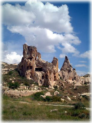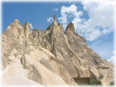 カッパドキアの奇岩その1。というか、このページの写真にはひたすら奇妙な岩が並んでいるので、興味のない方はご勘弁を(笑)。カッパドキアがスゴイのは、なんとこの奇岩に人が住んでいる(いた)ということ。いまでも住居や宿として岩が利用されています |