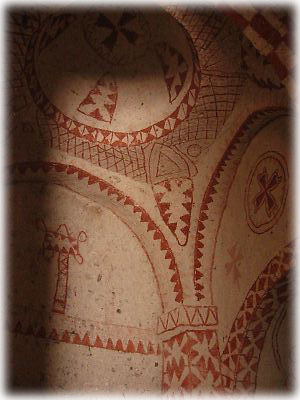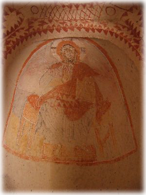 奇岩の中の空間を利用した教会。乾いた岩肌にかすかに赤い色でフレスコ画が残る。保存状態はあまりよくないけれど、確かにそれはかつてキリスト教があったことを証明する。この地には4世紀前後からキリスト教の修道士たちが住み着いたとか |